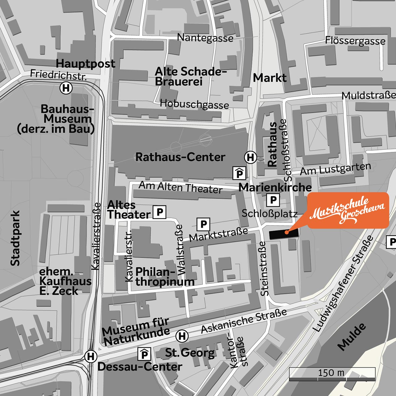 Buslinien 20 oder 12 bis Haltestelle Rathaus, von dort etwa zwei Gehminuten bis zur Musikschule Groschewa; Buslinie 13 (Richtung Waldersee) und Buslinie 15 (Richtung Sollnitz) bis Haltestelle St. Georg;